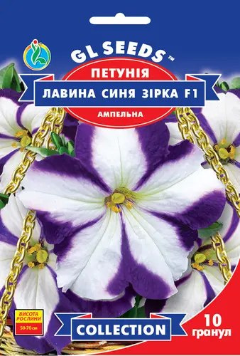 Популярна крупноквіткова ампельна гібридна петунія, утворює справжнє море з великих, діаметром 7-10 см, ефектних квіток з білою виразною зіркою на темно-синьому тлі. Довгі, пружні пагони до 60-80 см, звисають, формуючи яскравий квітковий каскад, що чудово поєднується з червоними, білими, пурпуровими, жовтими фарбами цієї серії. Для оформлення підвісних кошиків, кашпо, балконних і віконних ящиків, садових ваз. Віддає перевагу легкому, родючому, добре дренованому грунту.